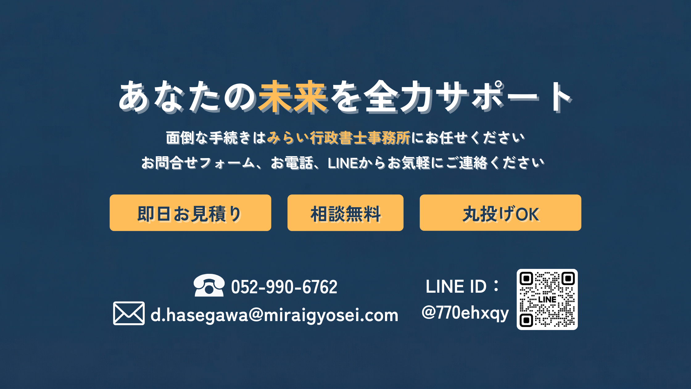 みらい行政書士事務所のホームページをご覧いただき、誠にありがとうございます。代表の長谷川大輔と申します。当事務所は、愛知県名古屋市を拠点に、建設業許可、自動車関連手続き、在留資格申請、相続・遺言など、幅広い行政書士業務を取り扱っております。お客様の「みらい」がより良いものになるよう、全力でサポートさせていただきます。どんな些細なことでも、まずはお気軽にご相談ください。