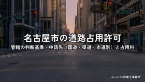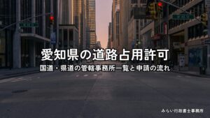 愛知県で道路占用許可を取得するには、道路の種類ごとに管轄が異なります。愛知県の道路占用許可は、国道(指定区間)なら国土交通省、国道(指定区間外)・県道なら愛知県の建設事務所、市町村道なら各市町村が窓口です。この記事では、 […]