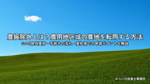 農振除外とは何か──農用地区域の農地転用に欠かせない前提手続き 農振除外とは、農業振興地域整備計画の「農用地利用計画」を変更し、農用地区域(いわゆる「青地」)から対象の農地を除外する手続きです。農用地区域内の農地は農業以 […]